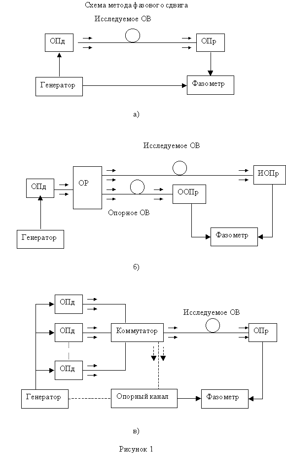 Одним из основных методов измерения времени распространения оптического сигнала в ОВ является метод фазового сдвига. Стандартами МЭК и МСЭ он рекомендован для использования при измерении хроматической дисперсии и удлинения ОВ и ОК [1-3]. Различные устройства, предназначенные для измерении хроматической дисперсии методом фазового сдвига описаны в [4-7]. Типичные схемы реализации этого метода приведены на рисунке 1. В простейшей схеме (рис.1а) оптический передатчик ОПд, в состав которого входят источник излучения (лазерный диод или светодиод), схема управления его током накачки и схема поддержания температуры, модулируется синусоидальным сигналом электрического генератора с частотой f. Оптический сигнал ОПд проходит через исследуемое ОВ и поступает на оптический приемник ОПр. Фаза выходного сигнала ОПр сравнивается с помощью фазометра с фазой сигнала генератора, который выполняет роль опорного сигнала. Напряжение сигнала на выходе ОПр UОПр можно записать в виде: