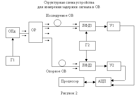 При использовании схемы рисунка 1а предполагается, что величина t' (задержка сигнала в аппаратуре) неизменна в процессе измерений. Часто это условие не выполняется с должной точностью, например, вследствие флуктуаций температуры, мощности и (или) длины волны источника излучения. Тогда используется другой способ организации опорного канала, как, например, на рисунке 1б. Здесь сигнал с выхода ОПд разделяется с помощью оптического разветвителя ОР на два. Один как и раньше подается на исследуемое ОВ и измерительный оптический приемник ИОПр, а другой - через опорное ОВ на второй, опорный оптический приемник ООПр. Задержка в исследуемом ОВ определяется по разности фаз выходных сигналов ИОПр и ООПр. В такой схеме изменение фазы сигнала ОПд или неконтролируемое изменение температуры окружающей среды вызовут одинаковые фазовые сдвиги в опорном и измерительном сигналах, и это не приведет к погрешности измерения задержки в исследуемом ОВ.