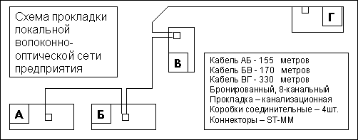 В качестве примера рассмотрим конкретный заказ локальной оптической сети - 4 здания, между ними 3 кабеля (броня, 8 каналов, волокно 62.5/125), общая длина кабелей 845 метров (в зданиях 35 метров); 4 соединительных кросса, стандарт соединителей ST. (рис. 1)