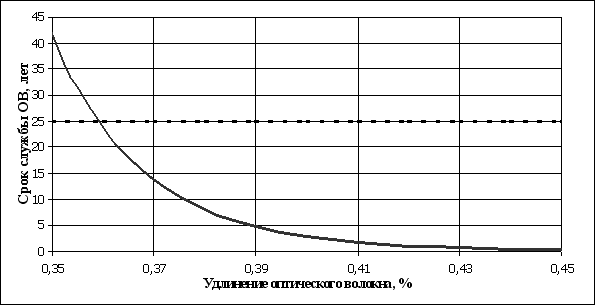 Видно, что срок службы, установленный потребителем ВОК, в 25 лет обеспечивается при значении удлинения менее 0,36 %, что определяет допустимую величину локальной механической растягивающей нагрузки в пределах 3 Н.