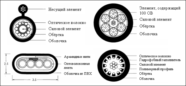 Рис. 5. Различные варианты конструкций оптических кабелей