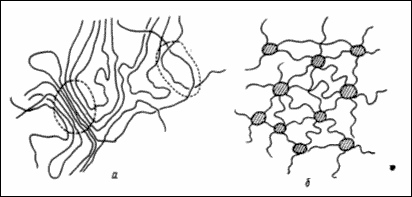 Как уже хорошо известно, молекулы полимера (макромолекулы) состоят из многократно повторяющихся структурных единиц, соединенных друг с другом химическими связями десятки и даже сотни тысяч раз. Макромолекула полимера может быть линейной и разветвленной, т. е. иметь боковые ответвления от основной цепи. За счёт них происходит соединение макромолекул между собой химическими связями. С увеличением разветвленности макромолекулы полимера нарушается его регулярность, вследствие чего снижается жесткость и склонность к кристаллизации. Большая длина макромолекулы при возможности вращения сегментов макромолекул относительно валентных связей главной цепи обуславливает способность молекулы полимера принимать различные конформации. Реализуемые конформации носят флуктуационный характер, т.е. в принципе форма цепной молекулы может постоянно изменяться. С энергетической точки зрения наиболее выгодная форма цепной молекулы - свернутая глобула (молекулярный клубок), что и реализуется в случае, если межмолекулярное взаимодействие существенно слабее внутримолекулярного (см. рис. 6). Этот клубок очень рыхлый - собственно полимер занимает лишь около 1 - 3 % от общего его объёма. Взаимодействие глобул создает определенные упорядоченные надмолекулярные структуры. В результате взаимодействия между соседними макромолекулами в полимере могут возникать области, в которых создаются более упорядоченные структуры (см. рис. 7а), которые в итоге образуют кристаллические структуры (см. рис. 7б).