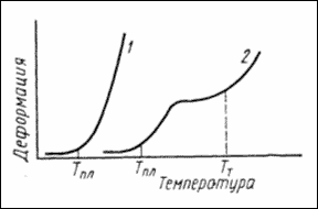 1 - после плавления полимер сразу переходит в вязкотекучее состояние