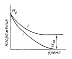 Рис. 10. Релаксация напряжения в линейном (1) и пространственно сшитом (2) эластомере