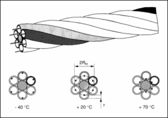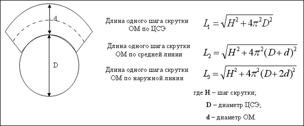 Укрутка оптического модуля в повиве зависит от следующих параметров: натяжение оптического модуля до его скручивания, диаметр центрального силового элемента, наружный диаметр оптического модуля, шаг скрутки, наличие и марка межмодульного гидрофобного заполнителя.