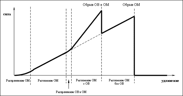 При дальнейшем увеличении нагрузки удлинению сопротивляется оболочка модуля вместе с оптическим волокном вплоть до обрыва последнего внутри модуля. Практически обнаружить излом на кривой растяжения и отметить момент распрямления оптического волокна удаётся лишь в очень ограниченном числе случаев для тонкостенных слабоупругих оболочек. Но главная проблема состоит в том, что упругие свойства оболочки модуля меняются во времени да ещё зависят от условий его хранения. Тогда длина оптического модуля, отмеренная при одинаковой нагрузке, становится разной. Не лучше обстоит дело и с измерением длины отрезка оптического волокна, извлечённого из отрезка оптического модуля. Мы можем только утверждать, что прилагаемая к отрезку волокна в процессе измерения растягивающая нагрузка должна приводить к его удлинению, много меньшему 0,3 % (для обеспечения требуемого срока службы кабеля, как это отмечено выше, растяжение не должно превышать указанного порога). Минимальная же величина прикладываемой нагрузки остаётся неопределённой и может быть оценена при анализе кривой растяжения оптического волокна. Таким образом, корректной может оказаться лишь методика сравнительных измерений, при условии сохранения неизменными ряда влияющих на результат параметров. Во всяком случае, так можно измерить, например, относительное распределение избыточных длин нескольких оптических волокон в модуле.