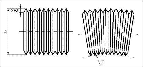 D - диаметр по протектору, δ - высота гофры, R - радиус изгиба.