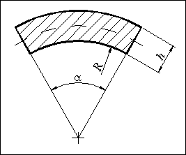 Рис.4. К рассмотрению механизмов удлинения фольги - удлинение за счет профиля гофрирующих колес, где: α - угол изгиба, R - радиус изгиба, h - толщина ленты.