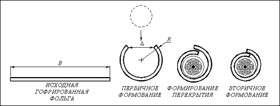 Как видно из приведенного рисунка на этапе первичного формования гофрированная фольга шириной B сгибается до формы незамкнутой окружности радиуса R (формула для расчета приведена ниже) с "зазором" шириной Δ, в который укладывается сердечник вместе с водоблокирующим или водопоглощающим материалом. Далее зазор постепенно уменьшается до смыкания краев ленты, формируется участок перекрытия одного края поверх другого, а при вторичном формовании диаметр протектора уменьшается до плотного облегания заготовки. Завершающая стадия процесса - нанесение полимерной оболочки экструзионным методом, при котором происходит сплавление ламинанта ленты и полимерной оболочки, а также краев, образующих нахлест, что обеспечивает необходимую герметичность и водонепроницаемость изделия. Подробно вопросы, связанные с экструзионным процессом в технологии кабельного производства, рассмотрены в [8].