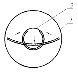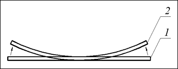 Сразу заметим, что, поскольку входной диаметр конуса больше ширины фольги, загиб ленты вверх и вниз равновероятен и зависит от варианта ее заправки. Целесообразно осуществлять предварительный загиб, который бы задавал преимущественное направление дальнейшей деформации. Для этого, в наиболее простом случае, можно применить протягивание гофрированной фольги через щель на входе прямую, а на выходе с некоторой кривизной (см. рис. 8).