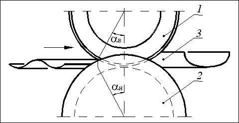 1 и 2 - верхний и нижний ролики соответственно, 3 - гофрированная фольга, αВ и αН- зона от касания фольги верхним и нижним роликами до ее полной деформации