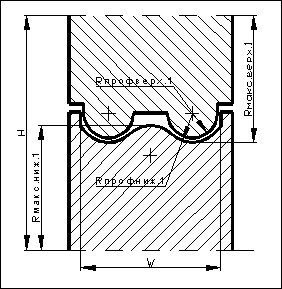 Rпроф.ниж.1 - радиус профиля нижнего ролика; Rмакс.ниж.1 - радиус нижнего ролика в точке максимума; W - ширина входа в ролик; Rпроф.верх.1 - радиус профиля верхнего ролика; Rмакс.верх.1 - радиус верхнего ролика в точке максимума; H - межосевое расстояние.