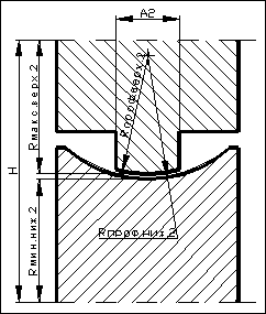 Rпроф.ниж.2 - радиус профиля нижнего ролика; Rмин.ниж.2 - радиус нижнего ролика в точке минимума; Rпроф.верх.2 - радиус профиля верхнего ролика; Rмакс.верх.2 - радиус верхнего ролика в точке максимума; A2 - ширина верхнего ролика; H - межосевое расстояние.