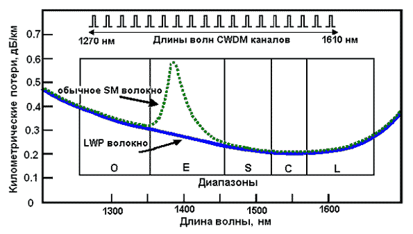 В 1998 году лаборатория Белла (Bell Labs) представила первое оптическое волокно с расширенным спектральным диапазоном пропускания - LWP, которое допускает передачу сигнала во всех диапазонах длин волн CWDM, включая E диапазон.