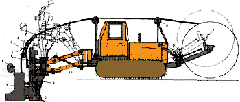 1 - держатель барабана; 2 - тормоз барабана; 3, 4 - направляющий ролик; 5 - вибратор; 6 - кассета для сигнальной ленты; 7 - кассета кабельного ножа; 8 - режущая кромка кабельного ножа; 9 - режущая кромка кабельного ножа; 10 - привод подъема кабельного ножа.