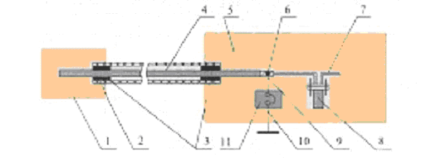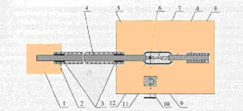 1 - ОК; 2 - герметизированный проводник от бронепокрова (провод КИП); 3 - узел герметизации ОК и провода КИП в устройстве ввода; 4 - корпус устройства ввода ОК; 5 - заливка эпоксидным или полиуретановым компаундом; 6 - уплотнительная прокладка фланцевого соединения; 7 - вводной патрон; 8 - герметизация ОК по внутренней оболочке относительно вводного патрона; 9 - оптическое оконечное устройство; 10 - подземная часть контейнера НРП-О; 11 - металлический бронепокров ОК
