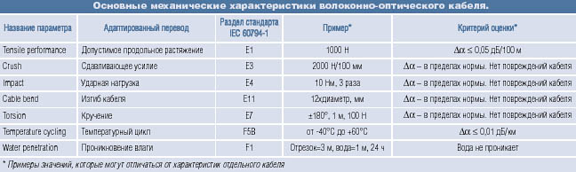 В колонках "Пример" и "Критерий оценки" приведены ориентировочные значения параметров волоконно-оптического кабеля, которые можно встретить в технических описаниях. Механические характеристики волоконно-оптических кабелей специального назначения здесь не рассматриваются.