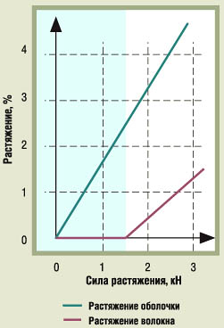 Зависимость растяжения волокна и оболочки кабеля от прилагаемой силы растяжения