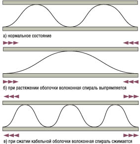 Почему не сразу происходит растяжение оптического волокна? Длина волокна в кабеле превышает длину его оболочки - световоды свободно располагаются в гелезаполненной трубке в виде спирали (рис. а). При растяжении кабельной оболочки волоконная спираль распрямляется (рис. б), при сжатии - наоборот, сжимается (рис. в).