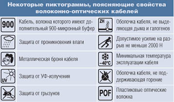 Оригинальное решение для указания наиболее важных свойств кабеля предлагает компания R&M. Речь идет об использовании ряда пиктограмм, предоставляющих наглядную информацию о волоконно-оптическом кабеле. Некоторые из таких пиктограмм представлены в таблице ниже.