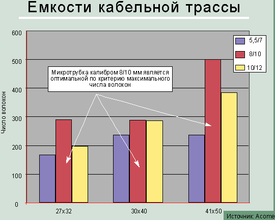 Применение техники микроканалов обеспечивает существенно большую гибкость в отношении выбора емкости линейных кабелей и позволяет выполнять ее наращивание со значительно меньшими затратами. При помощи данной техники в каналах кабельной канализации удается проложить значительно большее количество волокон по сравнению с традиционными подземными сооружениями. В трубчатый кабель с внешним диаметром около 50 мм помещается до семи миниатюрных полиэтиленовых трубок диаметром 8/10 мм, в каждой из которых можно разместить микрокабель с максимальной емкостью 72 волокна. В результате суммарная емкость увеличивается с 288 до 504 волокон.