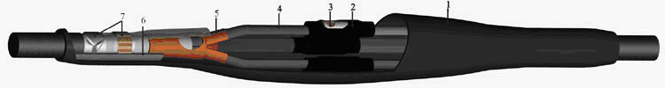 1 - кожух термоусаживаемый, 2 - манжета изолирующая, 3 - соединитель болтовой, 4 - жильная трубка 5 - перчатка низковольтная, 6 - лента-герметик, 7 - комплект заземления |
