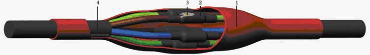 1 - кожух термоусаживаемый, 2 - манжета изолирующая, 3 - соединитель болтовой, 4 - лента-герметик |