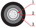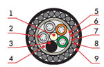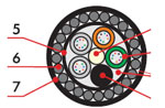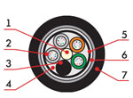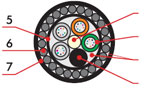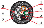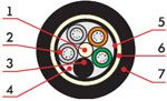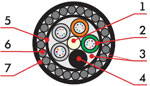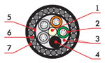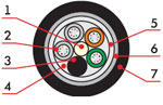 1. Центральный силовой элемент – стеклопластиковый стержень 2. Полимерная трубка со свободно уложенными оптическими волокнами и гидрофобным гелем 3. Кордель (по заказу 2,4 или 8 медных изолированных жил) 4. Межмодульный гидрофобный заполнитель 5. Водоблокирующая лента 6. Стальная гофирированная лента 7. Наружная оболочка из светостабилизированного полиэтилена высокой плотности (может быть выполнена из материала не распространяющего горение) |