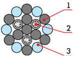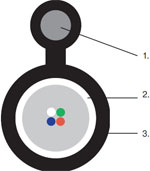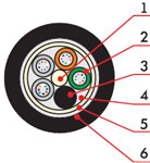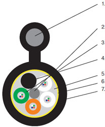 1. Центральный силовой элемент стеклопластиковый стержень 2. ПБТ трубка со свободно уложенными оптическими волокнами и гидрофобным гелем 3. Кордель (по заказу 2, 4, 8 медных изолированных жил) 4. Гидрофобный заполнитель 5. Промежуточная ПЭ оболочка 6. Водоблокирующая и стальная гофрированная лента, наложеная продольно с перекрытием 7. Наружная черная ПЭ оболочка с маркировкой. Для кабелей ДПН из материала, не распространяющего горение |