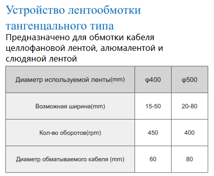 Применение: Данная машина вертикального типа применяется для наложения двойного слоя ленты. Находит широкое применение в обмотке огнестойкого кабеля слюдяными лентами.