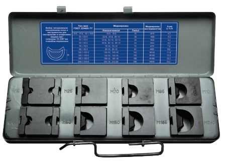 Набор инструментов типа НИОМ предназначен для оконцевания и соединения медных жил способом опрессовки на прессах ПГР-20 М 1, РМП-22 М, ПГ-20/24