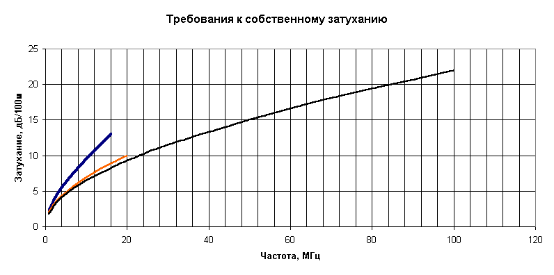 Как следствие изменяется от частоты и затухание. Оно растет приблизительно пропорционально квадратному корню из частоты. Точная зависимость определяется конструкцией конкретного кабеля, однако затухание во всем частотном диамазоне не должно превышать норм, определенных стандартами. В зависимости от категории кабеля требования к затуханию выражаются как: