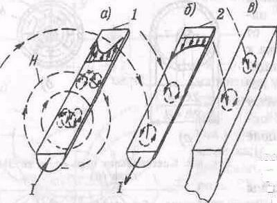 При поверхностном эффекте вихревые токи от переменного магнитного поля проводника с током 1 взаимодействуют с током этого же проводника (рис). В центре эти токи направлены встречно, а по краям попутно вызвавшему их току.В результате плотность тока увеличивается по мере удаления от центра проводника к его поверхности. Внутренние слои проводника при этом как бы не используются.