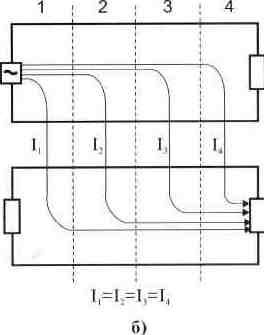 Эффект близости наблюдается при взаимодействии вихревых токов, наведенных магнитным полем проводника 1 в соседнем проводнике 2, с основным током этого проводника (рис). В результате такого взаимодействия происходит перераспределение плотности тока во втором проводнике, при этом она увеличивается на взаимообращенных друг к другу сторонах проводников симметричной цепи в случае, когда токи в проводниках текут в противоположных направлениях и на взаимно удаленных поверхностях при одинаковом направлении токов.