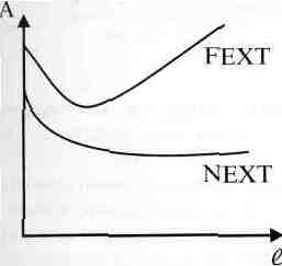 Зависимости NEXT и FEXT от длины линии показаны на следующем графике: