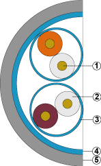 Конструкция 1. Медный проводник диаметром 0,52 мм (24 AWG)*. 2. Полиэтиленовая изоляция. 3. Экран поверх витой пары 4. Общий экран. 5. Полимерная оболочка. * - Для увеличения дальности прокладки кабеля возможно использование медной проволоки диаметром 0,64 мм (22AWG) |