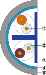 Конструкция 1. Медный проводник диаметром 0,52 мм (24 AWG)*. 2. Полиэтиленовая изоляция. 3. Сепаратор. 4. Общий экран. 5. Полимерная оболочка. |