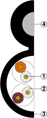 Конструкция 1. Медный проводник диаметром 0,52 мм (24 AWG)*. 2. Полиэтиленовая изоляция. 3. Защитный шланг из полиэтилена. 4. Стальной трос или стеклопластиковый пруток. * - Для увеличения дальности прокладки кабеля возможно использование медной проволоки диаметром 0,64 мм (22AWG) |