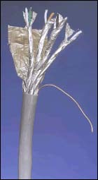 Для кабеля на основе витых пар используются медные проводники диаметром 22 - 24 AWG, что соответствует 0,64 - 0,51 мм в диаметре. Для кабеля, идущего на производство шнуров, для повышения гибкости используется многопроволочная жила несколько большего сечения, т.к. у многопроволочной жилы повышеное значение собственного затухания.