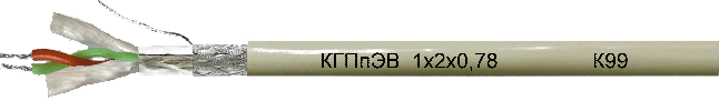 Пары с многопроволочными медными лужеными проводниками диаметром 0,78(7x26) мм, с изоляцией из пористого полиэтилена, в общем экране из алюмолавсановой ленты и оплетки из медных луженых проволок плотностью 65% с дренажным проводником. В оболочке из поливинилхлоридного пластиката для эксплуатации в закрытых помещениях – КГПпЭВ или светостабилизированного полиэтилена для эксплуатации на открытом воздухе – КГПпЭП или термопластичного полиуретана для эксплуатации в химически агрессивных средах с воздействиями вибрации и тряски – КГПпЭУ.