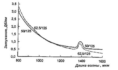 Широко используются два стандарта многомодового градиентного волокна - 62,5/125 и 50/125, отличающиеся профилем сердцевины. Соответствующие спектральные потери для типичных волокон показаны на рис. 1.
