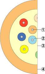 Конструкция 1. Оптическое волокно*. 2. Плотное буферное покрытие (tight buffer) 900 мкм. 3. Упрочняющие арамидные нити. 4. Оболочка из полимерного материала, не распространяющего горение или из безгалогенного материала с низким дымовыделением. * - Количество волокон данном кабеле - 2, 4, 6, 8, 12. (для количества волокон более 12, кабель имеет марку БПСР) Цвет оболочки кабеля соответствует следующей системе кодировки (если иное специально не оговорено в заказе): |