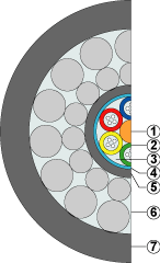 Конструкция 1. Центральный силовой элемент (ЦСЭ) - стеклопластиковый диэлектрический стержень 2. Оптический модуль со свободно уложенными волокнами в оболочке из ПБТ и заполненный гидрофобным заполнителем. 3. Межмодульный гидрофобный заполнитель. 4. Алюмополиэтиленовая лента*. 5. Промежуточная оболочка из полимерного материала. 6. Усиленная броня из двойного слоя стальных проволок. 7. Защитный шланг из полимерного материала. * - только для ДА2 |