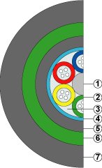 Конструкция 1. Центральный силовой элемент (ЦСЭ) - ДПЛ, ДАЛ - стеклопластиковый диэлектрический стержень. СПЛ, САЛ - стальная проволока. 2. Оптический модуль со свободно уложенными волокнами в оболочке из ПБТ и заполненный гидрофобным заполнителем. 3. Межмодульный гидрофобный заполнитель. 4. Алюмополиэтиленовая лента*. 5. Промежуточная оболочка из полимерного материала. 6. Броня из стальной гофрированной ленты. 7. Защитный шланг из полимерного материала. * - Только для ДАЛ, САЛ. |