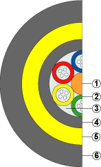Конструкция (Полностью диэлектрическая) 1. Центральный силовой элемент (ЦСЭ) - стеклопластиковый диэлектрический стержень. 2. Оптический модуль со свободно уложенными волокнами в оболочке из ПБТ и заполненный гидрофобным заполнителем. 3. Межмодульный гидрофобный заполнитель. 4. Промежуточная оболочка из полимерного материала. 5. Упрочняющие арамидные нити. 6. Защитный шланг из полимерного материала. |