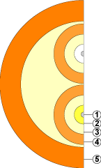 Конструкция 1. Оптическое волокно. 2. Плотное буферное покрытие (tight buffer) 900 мкм. 3. Упрочняющие арамидные нити. 4. Оболочка из полимерного материала. 5. Оболочка из полимерного материала, не распространяющего горение или из безгалогенного материала с низким дымовыделением. Цвет оболочки соответствует следующей системе кодировки (если иное специально не оговорено в заказе): |