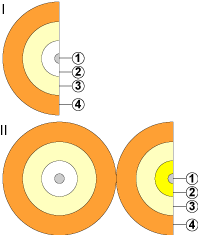 Конструкция 1. Оптическое волокно. 2. Плотное буферное покрытие (tight buffer) 900 мкм. 3. Упрочняющие арамидные нити. 4. Оболочка из полимерного материала, не распространяющего горение или из безгалогенного материала с низким дымовыделением. Кабель ЭКБ-БДШ (II) изготавливается в виде ленточной (плоской) конструкции из двух кабелей типа БСШ, оболочки которых соединены вдоль друг друга. Цвет оболочки кабеля соответствует следующей системе кодировки (если иное специально не оговорено в заказе): |