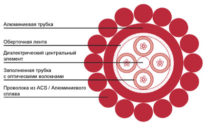 Алюминиевая трубка защищена одним или двумя слоями стальных проволок, покрытых алюминием (ACS) или сочетанием ACS проволок и проволок из сплава алюминия.