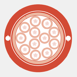 Конструкция кабелей с большим числом волокон для прокладки в кабельной канализации, содержащая шесть трубок, каждая из которых содержит от 4 до 6 12-волоконных жгутов.