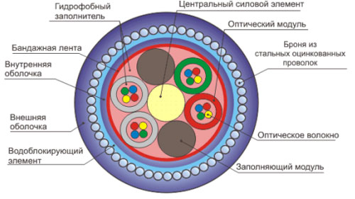 ![]() 1. Центральный силовой элемент; 2. Оптический модуль; 3. Оптическое волокно; 4. Гидрофобный заполнитель; 5. Бандажная лента; 6. Внутренняя оболочка; 7. Водоблокирующий элемент; 8. Броня из круглых стальных проволок; 9. Внешняя оболочка. |